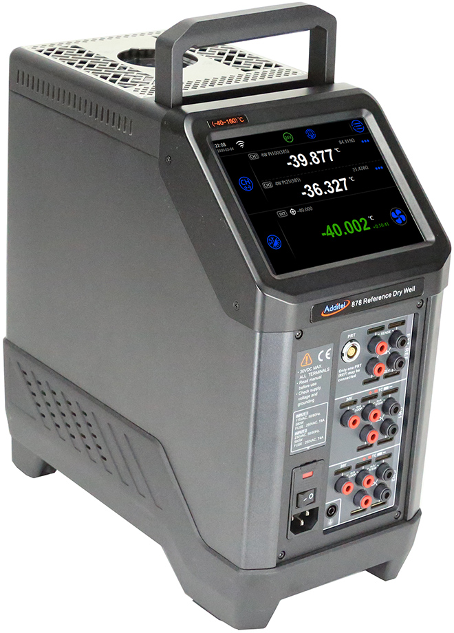 Additel ADT878 Dry Well Calibrator has three models to choose from, ranging from -40 to 1292°F. The Process Calibrator option adds an external reference input, a two-channel readout for UUT’s and a full complement of capabilities to help with everything from measuring temperature sensors, to calibrating thermocouples, self-calibrating the Reference Well and configuring HART transmitters. Each unit comes standard with a large touchscreen display and dual-zone control.