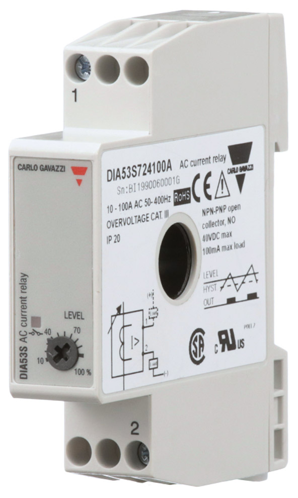 The Carlo Gavazzi DIA53 monitoring relay is a small current relay with built-in current transformer, adjustable set-point, and integrated solid state output. Self-powered and 2-wire connection for ease of installation and use. The 12mm hole for insulated current carrying wire makes it suitable for most applications. 17.5mm wide DIN rail mountable housing suitable both for back and front panel mounting.