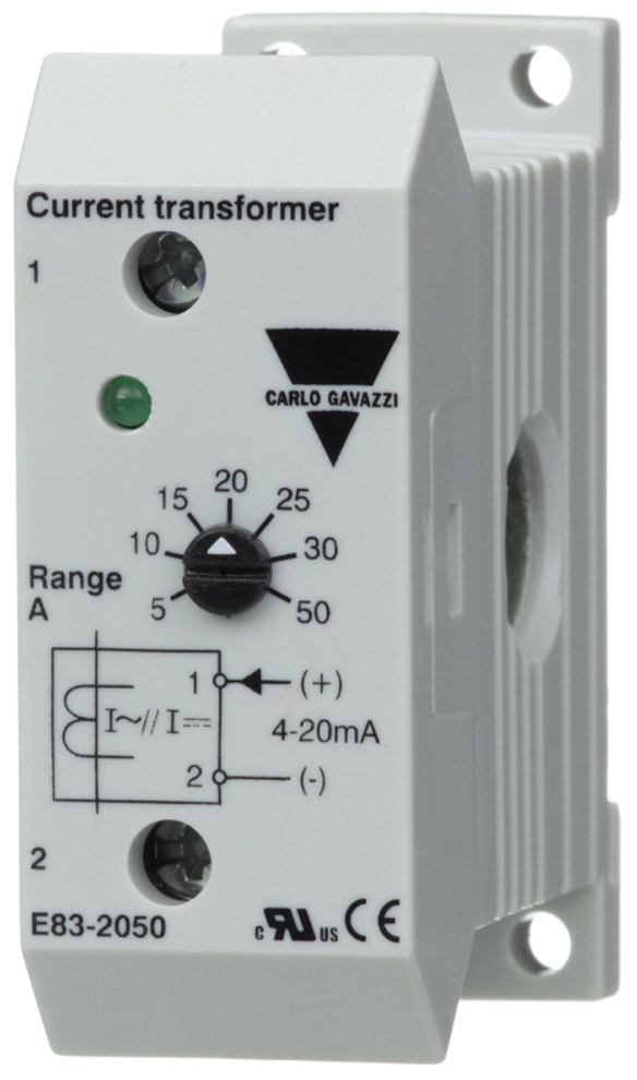 The Carlo Gavazzi E83-2050 monitoring relay is an AC current metering transformer with 7 knob-selectable ranges. Output from the E83-2050 is 4-20mADC in accordance with IEC 60381-1. In the 5A range, the relay is can be applied as a 4-20mADC signal converter for larger standard AC current transformers with 5AAC secondary output.