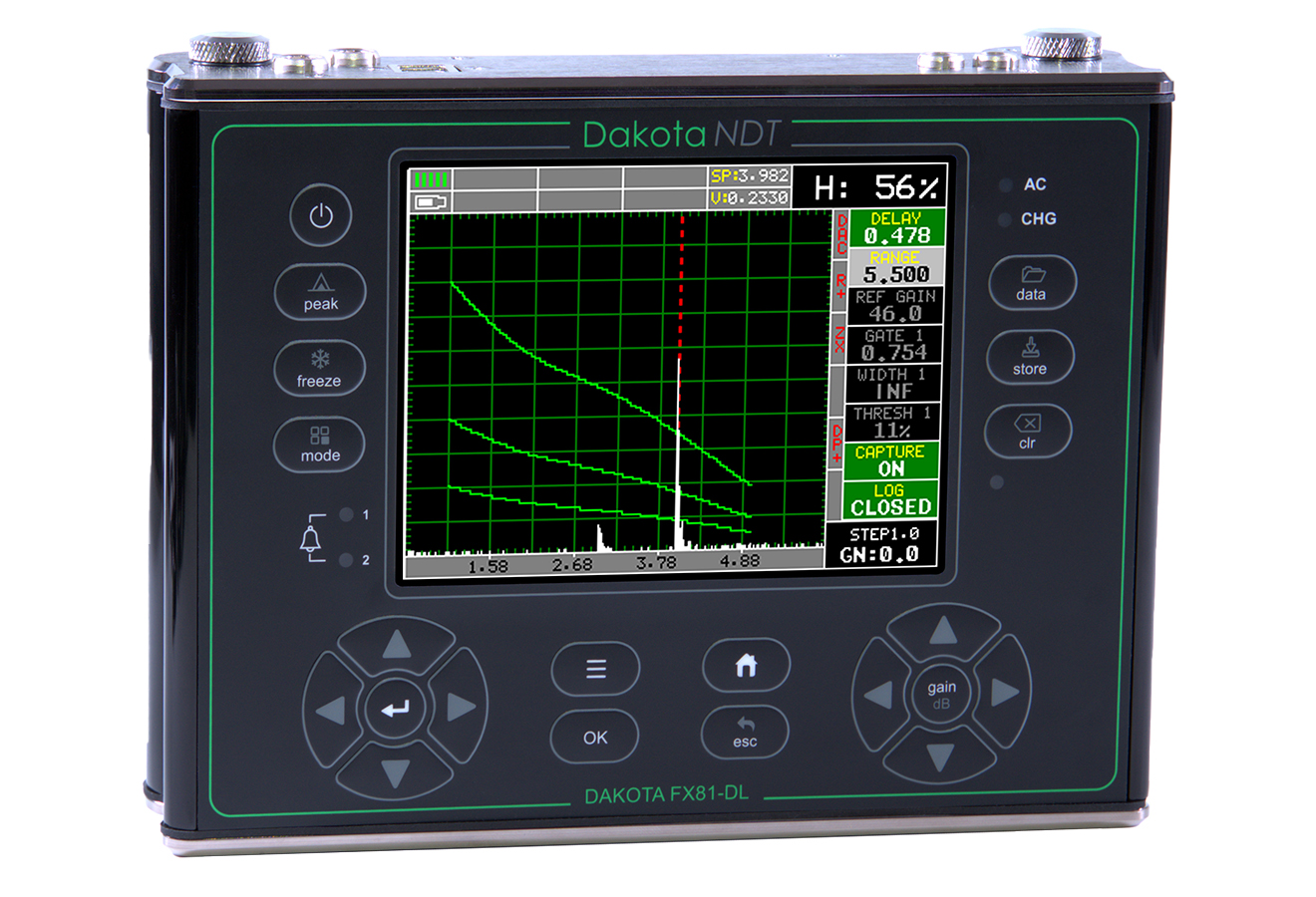 The FX81-DL flaw detector has a 6Gb internal memory and an external SD slot that allows up to 64Gb with full data logging via RS232 data output to DakMaster data management software.