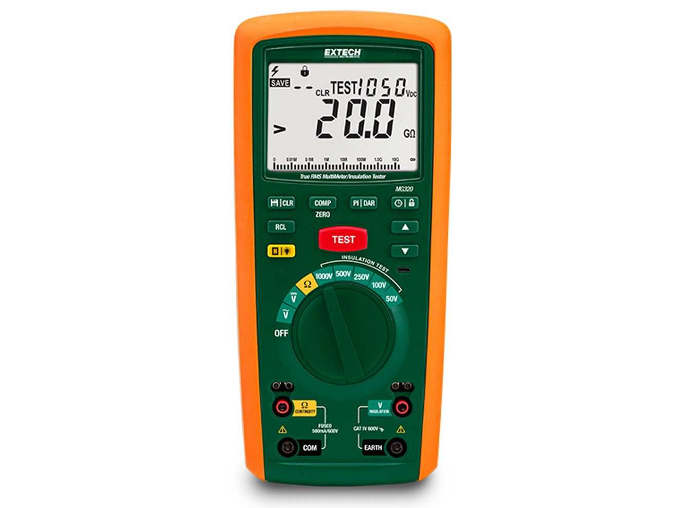 The Extech MG320 Insulation Tester / True RMS MultiMeter combines a 20GΩ/1000V high range Insulation Tester with a full-featured True RMS MultiMeter in a single, compact instrument. Insulation tester includes PI/DAR modes, programmable timer, and a comparator for custom test configurations and quick results. CAT IV-600V safety rating ensures the highest level of protection. The multimeter functions include AC/DC Voltage, Resistance, and Continuity Test. Manually store/recall up to 99 readings. Designed with rugged housing and large backlit 6,000 count LCD display with analog bar graph. Complete with test leads, alligator clip, 6 x AA batteries, and soft case.