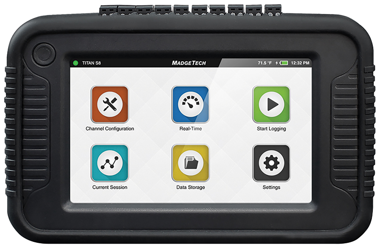 The entire MadgeTech Titan S8 device is handheld, meaning data measurement, equipment validation and process monitoring can travel wherever they are needed inside or outside of a facility. It has eight probe channels and a color touchscreen interface. Hold the MadgeTech Titan S8 confidently with one hand while placing leads and probes, and view data from multiple leads or locations at the same time. This versatile logger supports thermocouple, RTD or thermistor probes to measure current, voltage, temperature and pulse in real time. This adaptability makes Titan S8 perfect for any industrial engineer, quality assurance professional, compliance officer or automotive technician. The Titan S8 will automatically calculate FFT for users in real time providing exact frequencies to make post analysis data easily available for both vibrational and electrical applications.