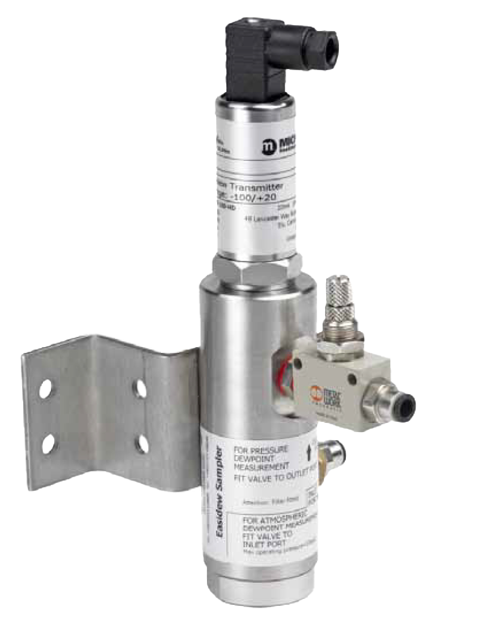 Improved response time when taking measurements is a benefit of the Easidew’s streamlined, single block stainless steel assembly. In addition to flow and pressure regulation, the Easidew is equipped with an in-line particulate filter, reducing the chance of contamination, and increasing accuracy of readings. The Easidew comes with a mounting bracket factory-fitted, easily adjustable for various installation requirements. For direct mounting, two M6x5mm deep mounting fixings (pitch at 20mm), are pre-installed into the block.
