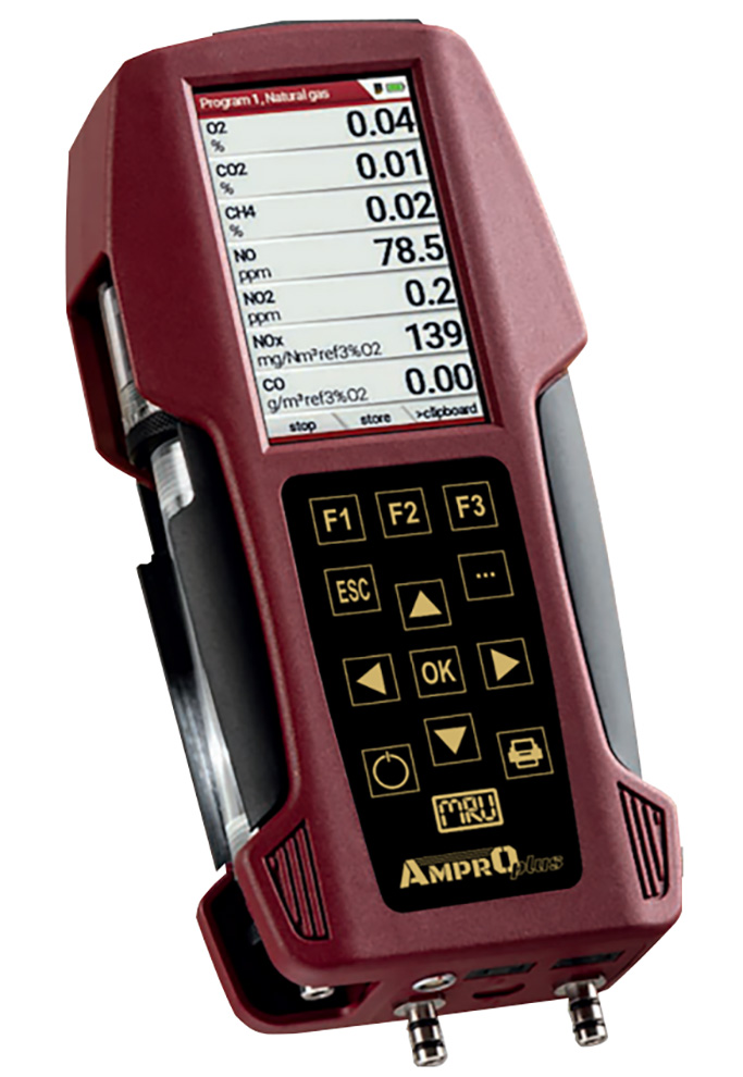 The MRU AMPRO Plus combustion & emission analyzer is a handheld gas analyzer capable of simultaneous measurement of up to seven gas components: oxygen, carbon monoxide, nitric oxide, nitrogen dioxide, sulfur dioxide, carbon dioxide, and hydrocarbon, all with appropriate sensors. The AMPRO Plus can additionally measure combustion air temperature, flue gas temperature, differential pressure and differential temperature.