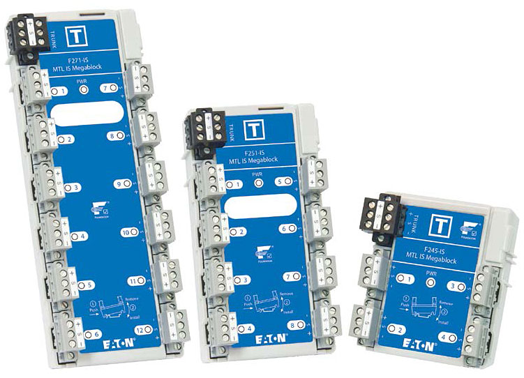 The F2xx-XE Megablocks are designed to meet the requirements for installation in an Ex e junction box in Zone 1. Within Zone 1, the F2xx-IS Megablocks are designed for installation in intrinsically safe applications, and are compatible with FISCO or Entity-approved field instruments. An intrinsically safe fieldbus allows live connection and disconnection of the fieldbus without the need for a gas clearance certificate, which assists in commissioning, maintenance and system expansions.